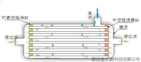 2、外壓式:外壓式中空纖維超濾膜則是原液經(jīng)壓力差沿徑向由外向內(nèi)滲透過中空纖維成為透過液,而截留的物質(zhì)則匯集在中空纖維的外部。其流向見圖三所示:
